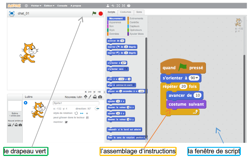 Pour lancer, on clique sur l'assemblage d'instructions ou le drapeau vert si le script commence par le bloc événement avec le drapeau vert